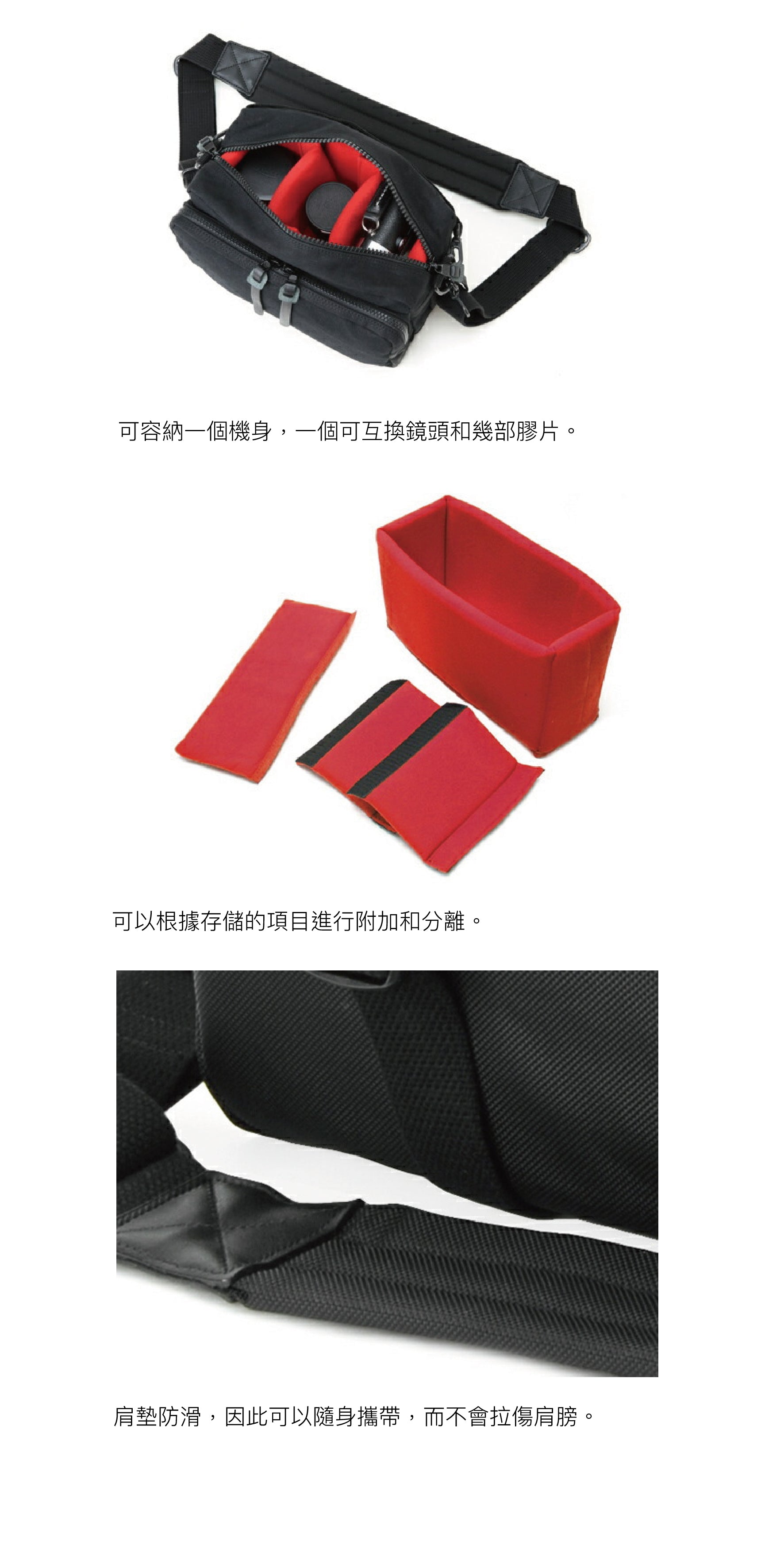 拉鍊式前袋為攝影和小物品提供了充足的空間。 可調節的肩帶可將包舒適地固定到位。 長而寬的肩墊具有粗糙防滑的一面,可將袋子牢牢貼住您的身體。