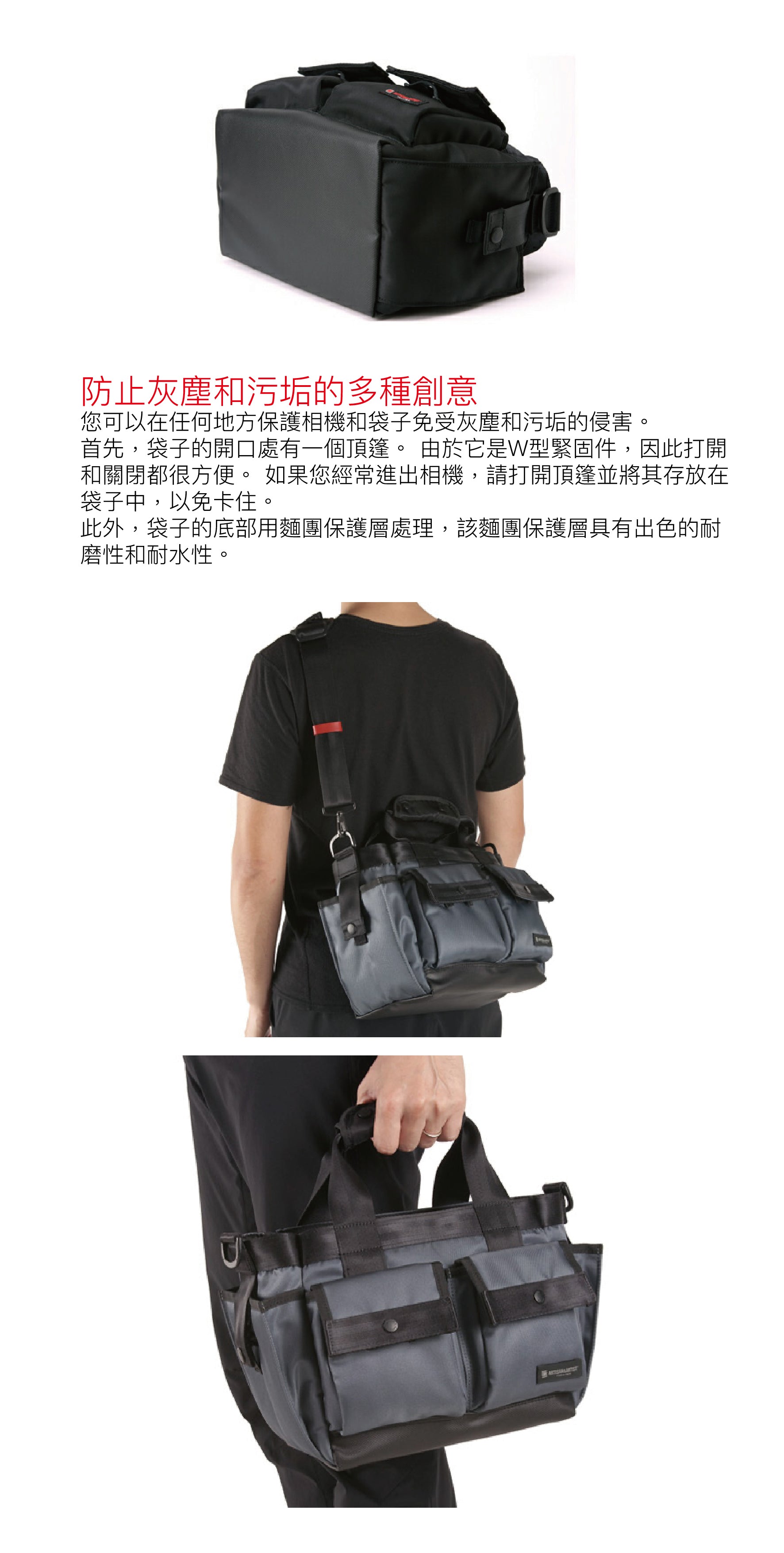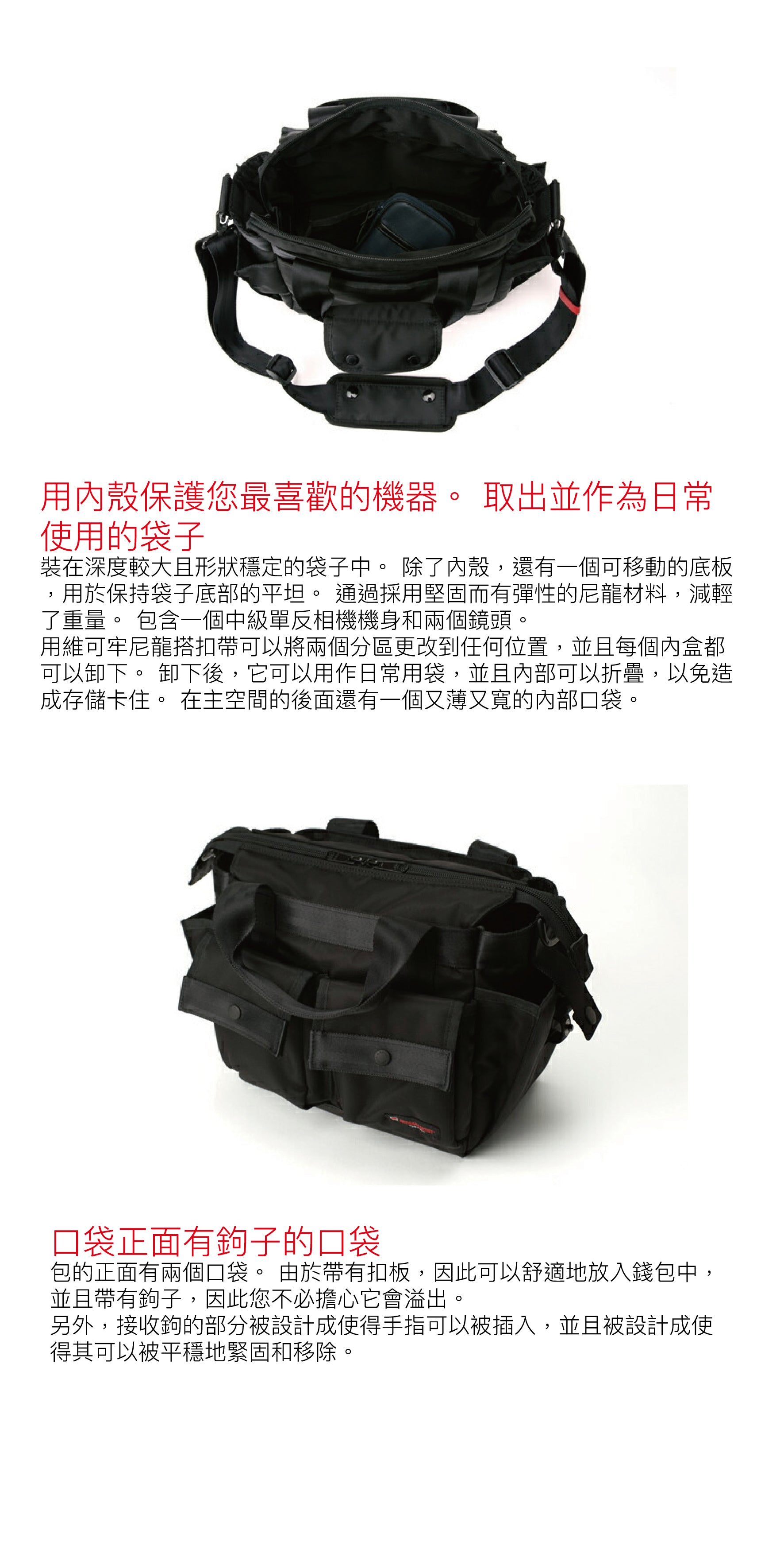 該袋具有可拆卸的內箱,內箱帶有可移動的隔板,可以將隔板拆下和定制,從而可以高效地進行存放。袋子底部的一種特殊類型的厚尼龍,可確保出色的耐用性和耐污染性。外部口袋可用於存放各種小物件和相機配件。