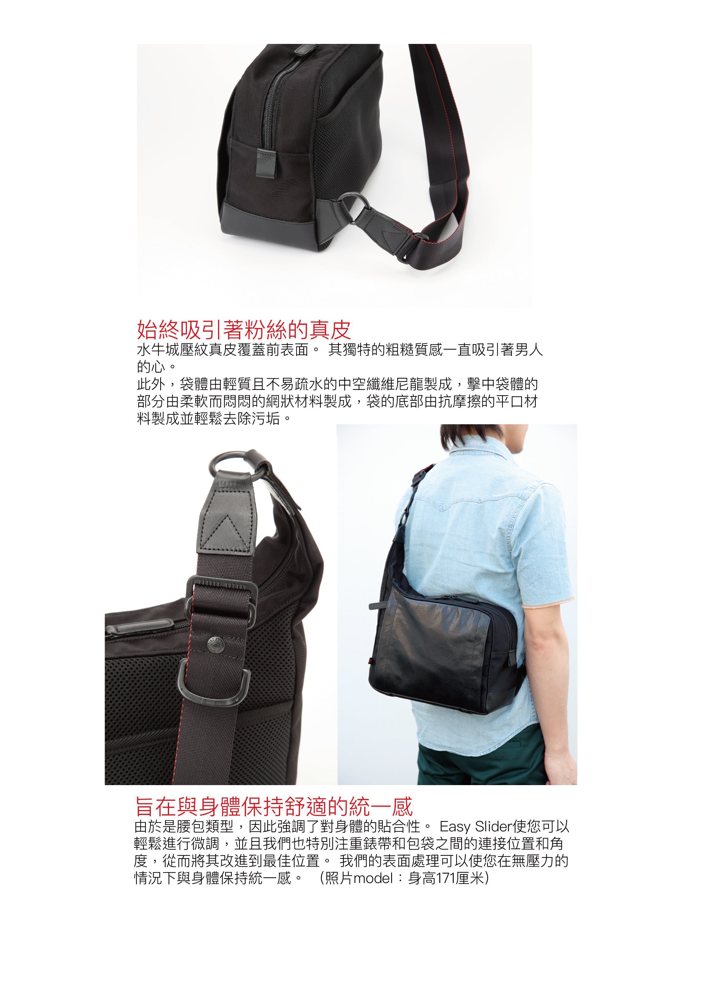 這款輕巧實用的背帶袋用於無反光鏡相機,配有Easy Slider作為肩帶,可隨時輕鬆取用相機或其他物品。 可以通過上下滑動D形環輕鬆地調節和固定皮帶的長度。