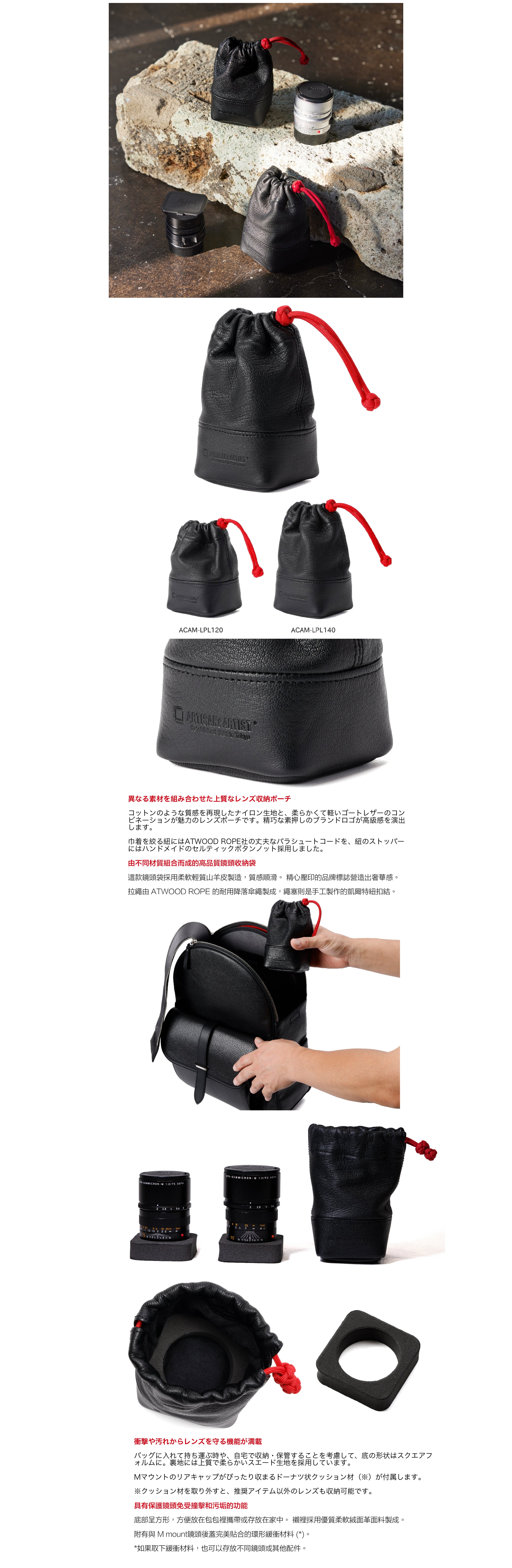 這款優質鏡頭袋完全由皮革製成,既柔軟又輕盈。 所使用的山羊皮革具有獨特的粒面紋理,並且不變形。 浮雕品牌標誌營造出奢華感。