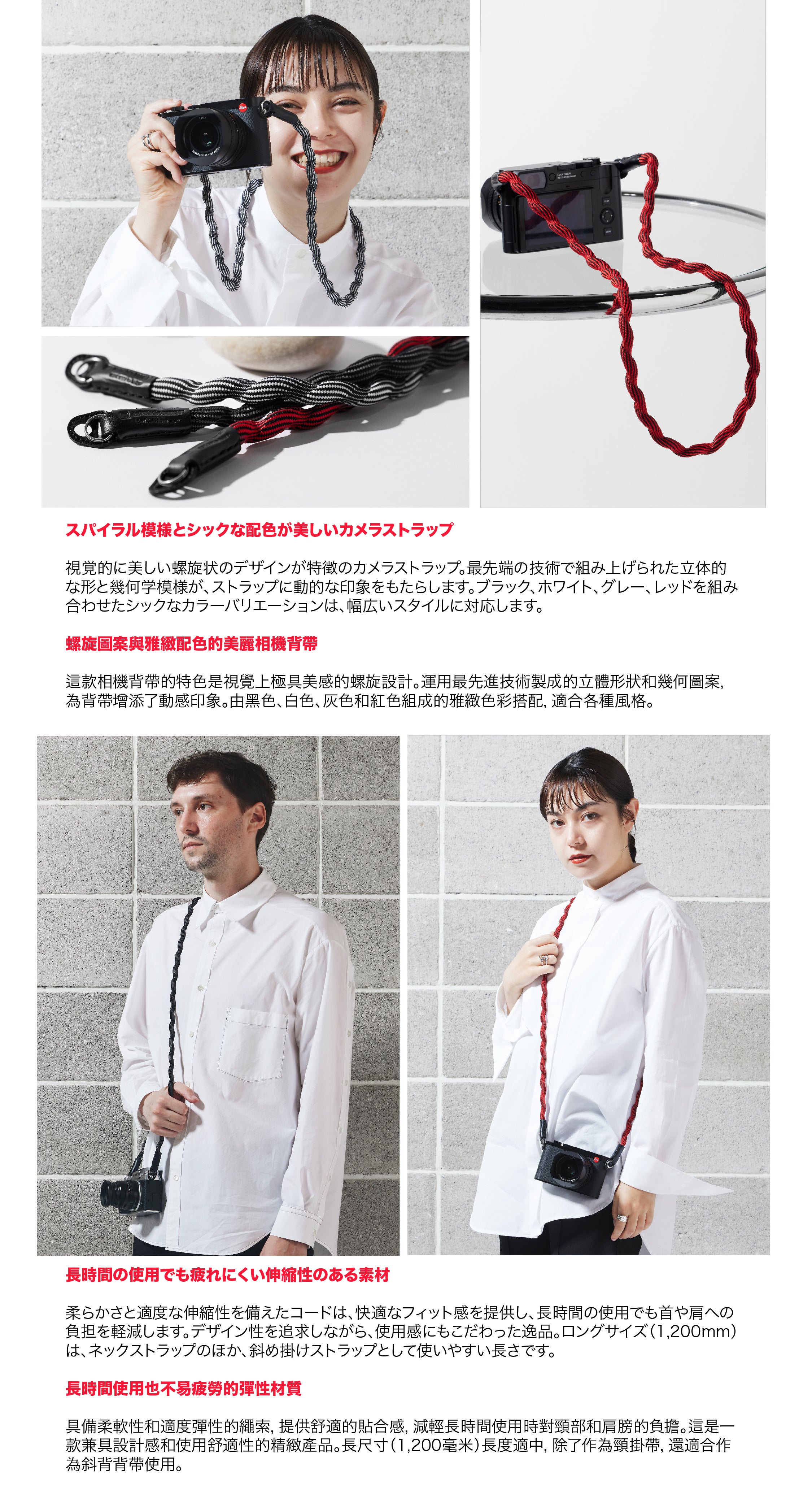 一款適合獨特攝影師的精緻相機帶。時尚風格的設計融合了視覺上美麗的螺旋和幾何圖案,