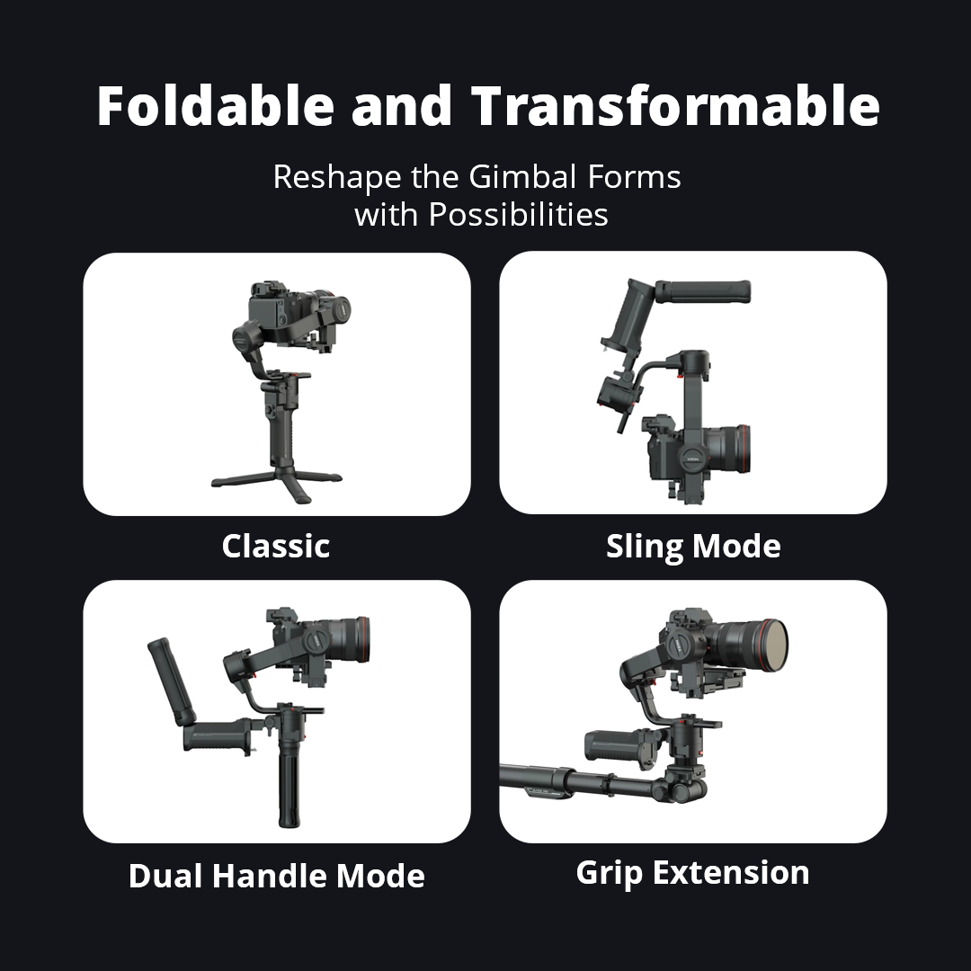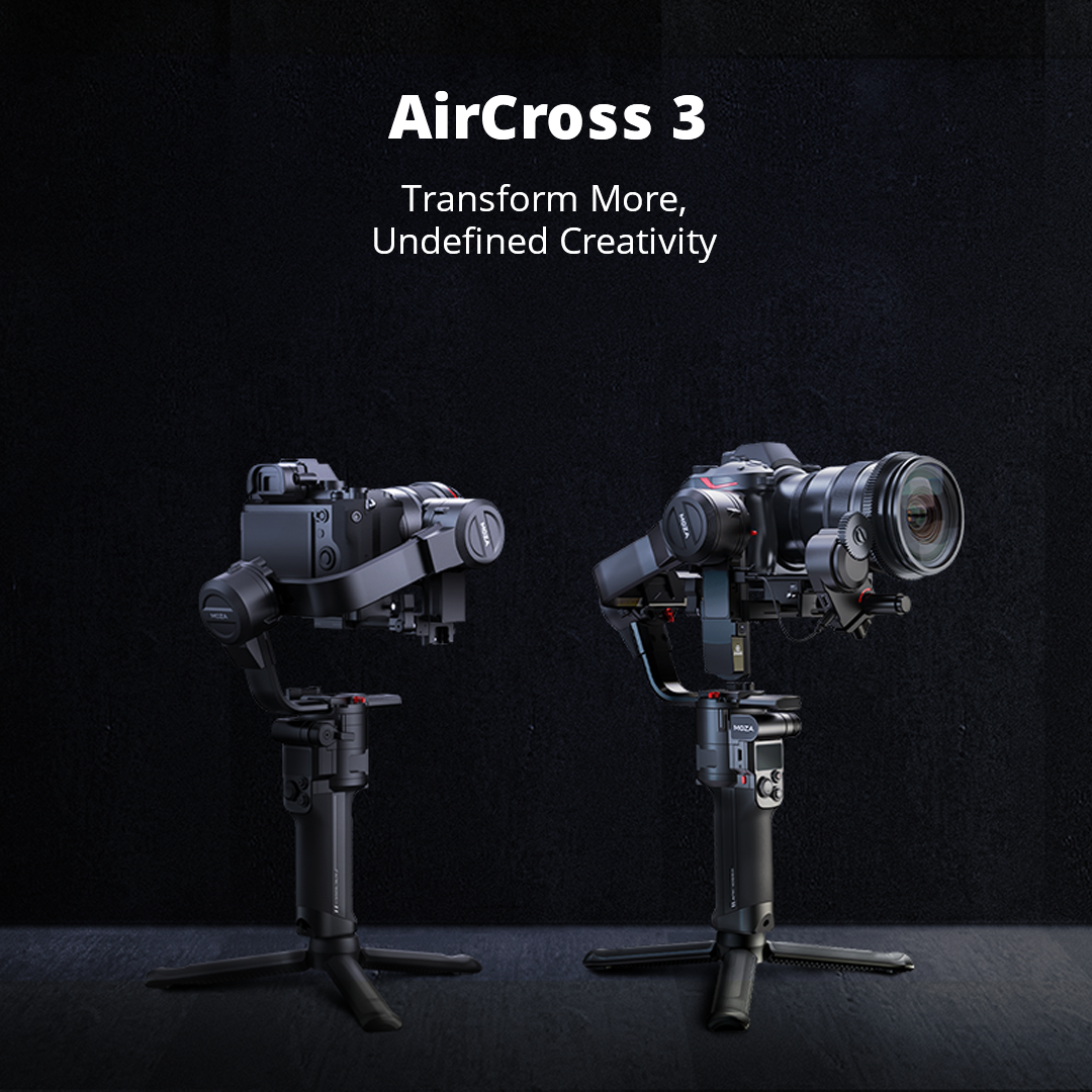 - The Moza AirCross 3 is essentially four gimbals in one. Its foldable design allows you configure it in the way that best suits your filming style.