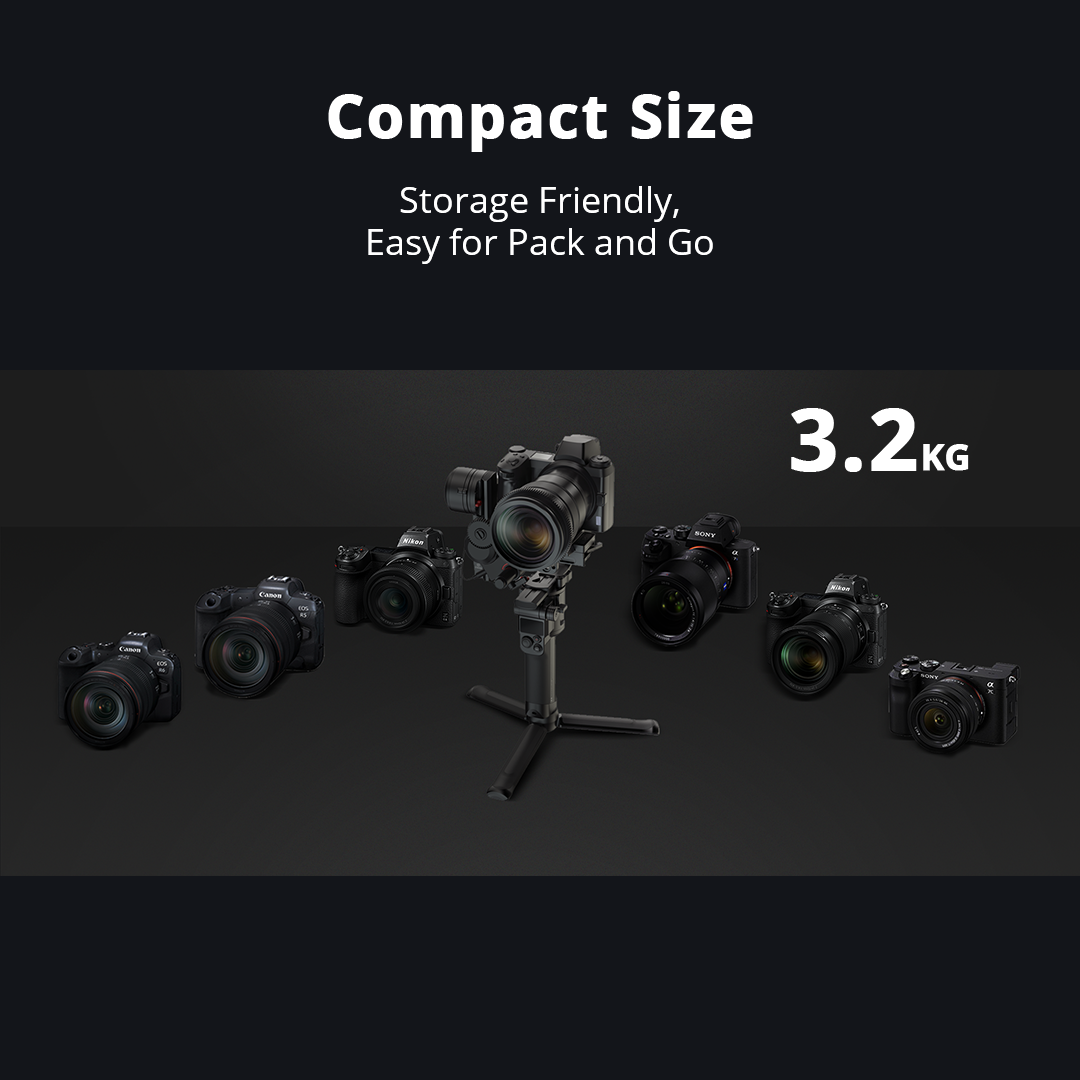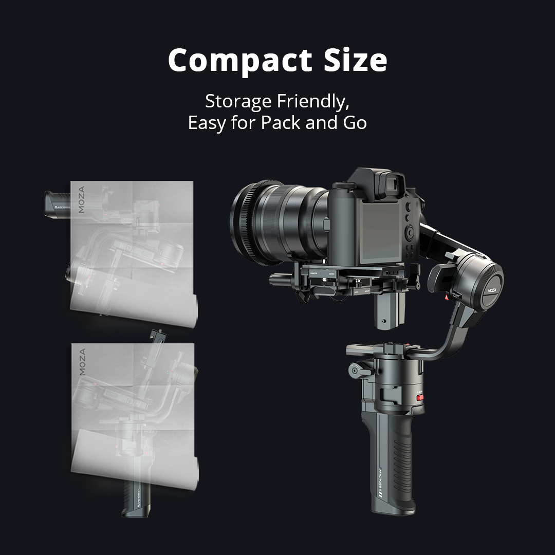 The MOZA AirCross 3 is the size of an A4 piece of paper when folded down. Its impressively compact design allows you to pack it down in a matter of moments ready for the next shoot. It will fit easily into a camera bag, travel bag or even your daily backpack.