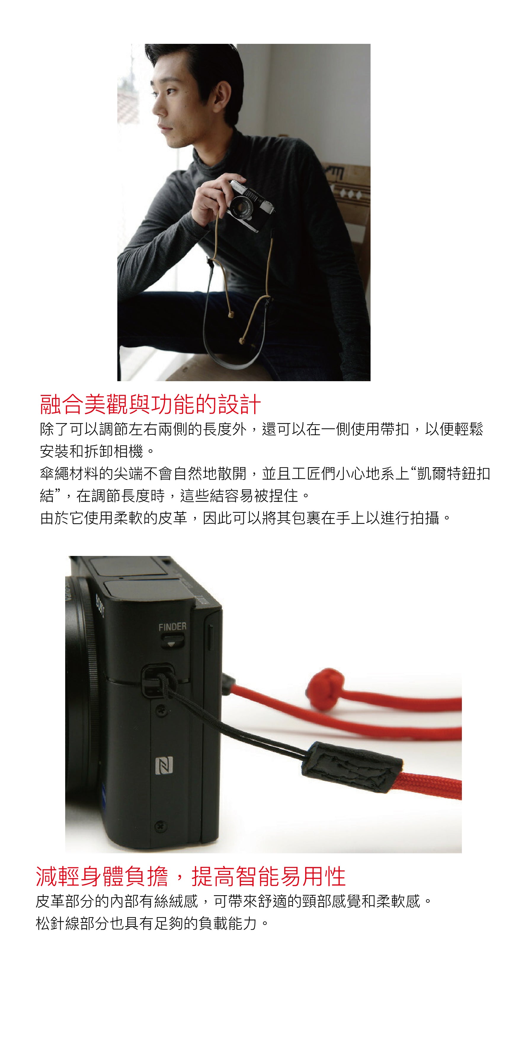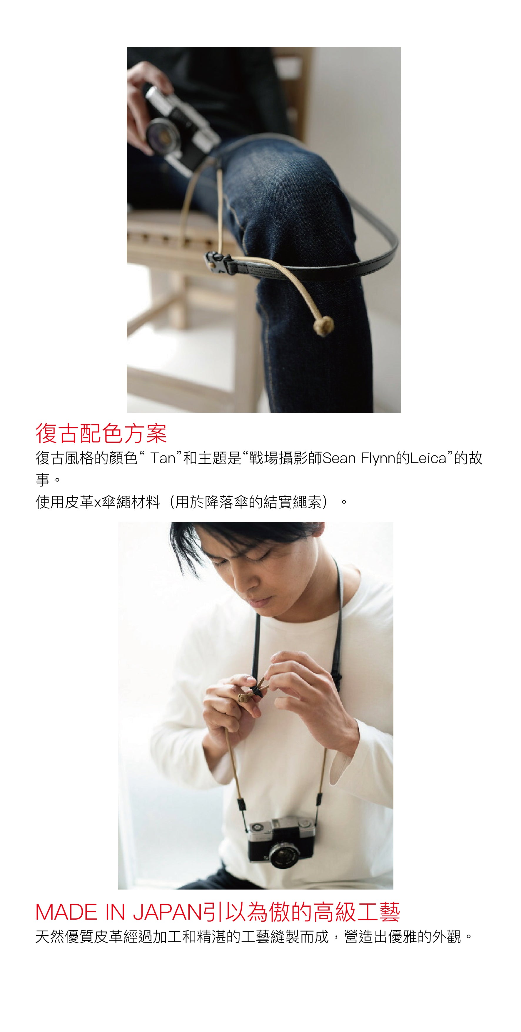 by the paracordstrap used on the American photojournalist Sean Flynn’s Leica M2 camera. The strap combines leather and paracordmaterial with a greatfunctionality. The length on both left and right sides can be easily adjusted. The tip of the paracordnever comes loose naturally, as each cord is woven carefully with “Celtic button knots” by artisans, enabling the user to easily hold the knot when adjusting the strap.