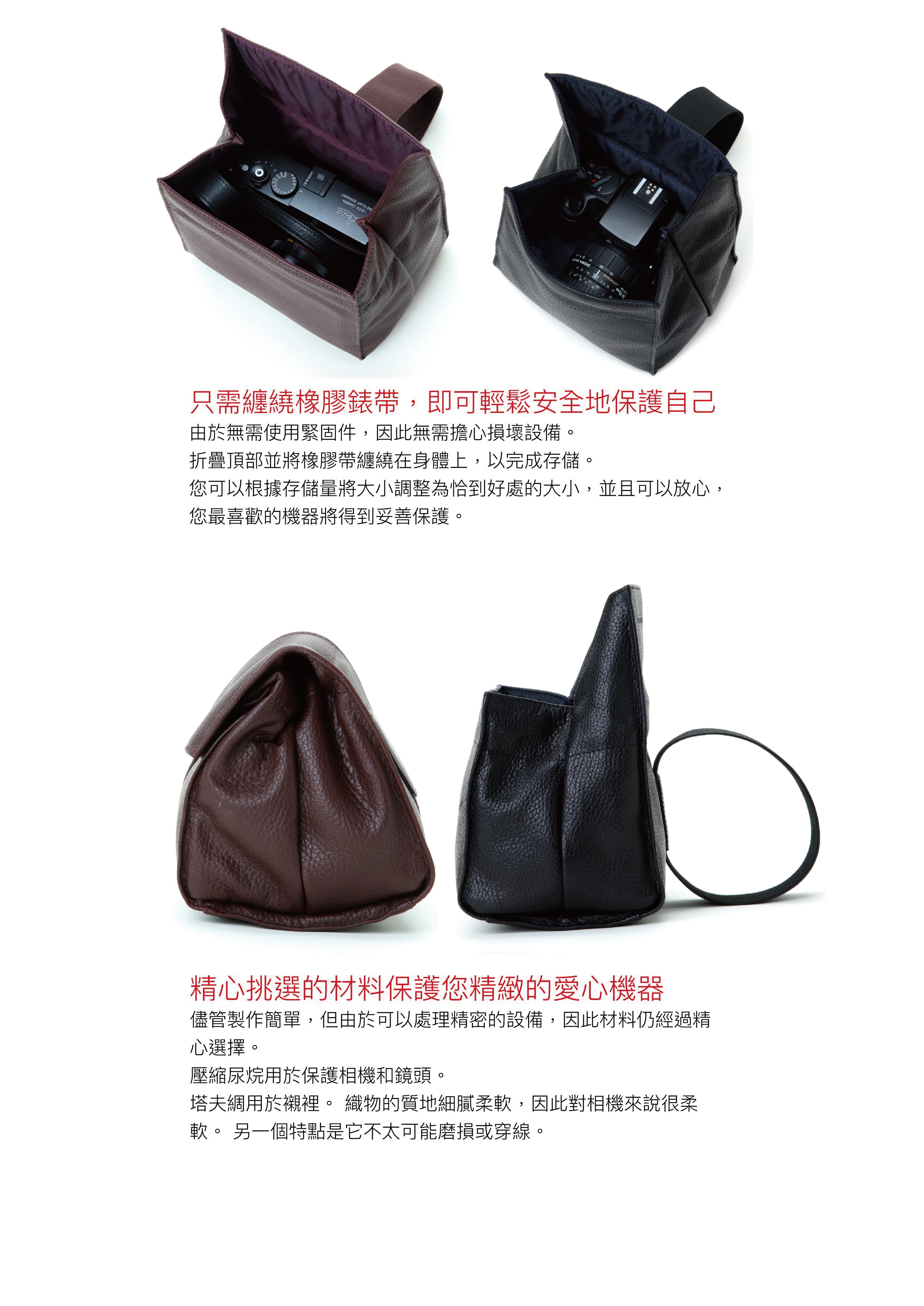 Thanks to firm elastic band, the size of the pouch can be adjusted, allowing different kinds of cameras to be carried.